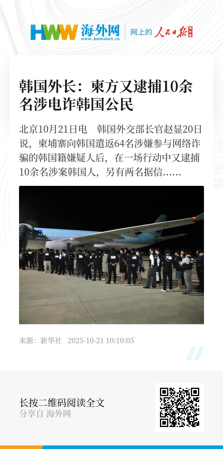 新华社北京10月21日电 韩国外交部长官赵显20日说,柬埔寨向韩国遣返64名涉嫌参与网络诈骗的韩国籍嫌疑人后,在一场行动中又逮捕10余名涉案韩国人,另有两名据信被犯罪团伙拘禁的韩国人获救。