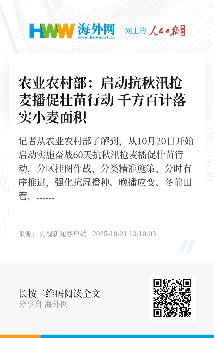 记者从农业农村部了解到,从10月20日开始启动实施奋战60天抗秋汛抢麦播促壮苗行动,分区挂图作战、分类精准施策、分时有序推进,强化抗湿播种、晚播应变、冬前田管,千方百计落实小麦面积,全力以赴抓好冬前管理,培育壮苗保安全越冬。