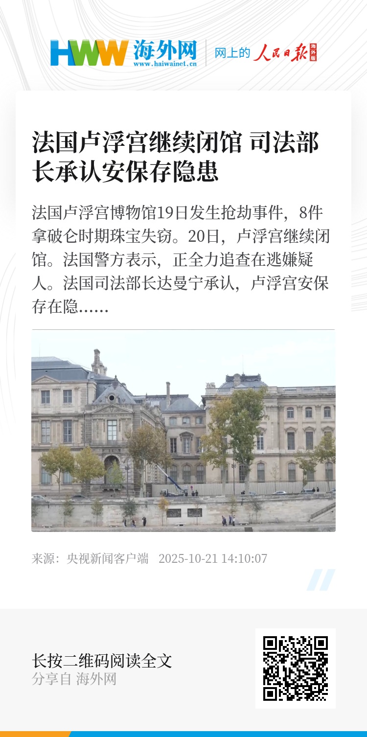 19日,卢浮宫文物遭劫后,法国司法部长达曼宁在接受采访时承认,卢浮宫安保确实存在隐患。他表示,作案团伙竟能在巴黎市中心几分钟内盗走无价之宝,这给法国的国家形象蒙上了一层阴影。法国内政部长努涅斯已下令加强文化遗址周边的安保措施。