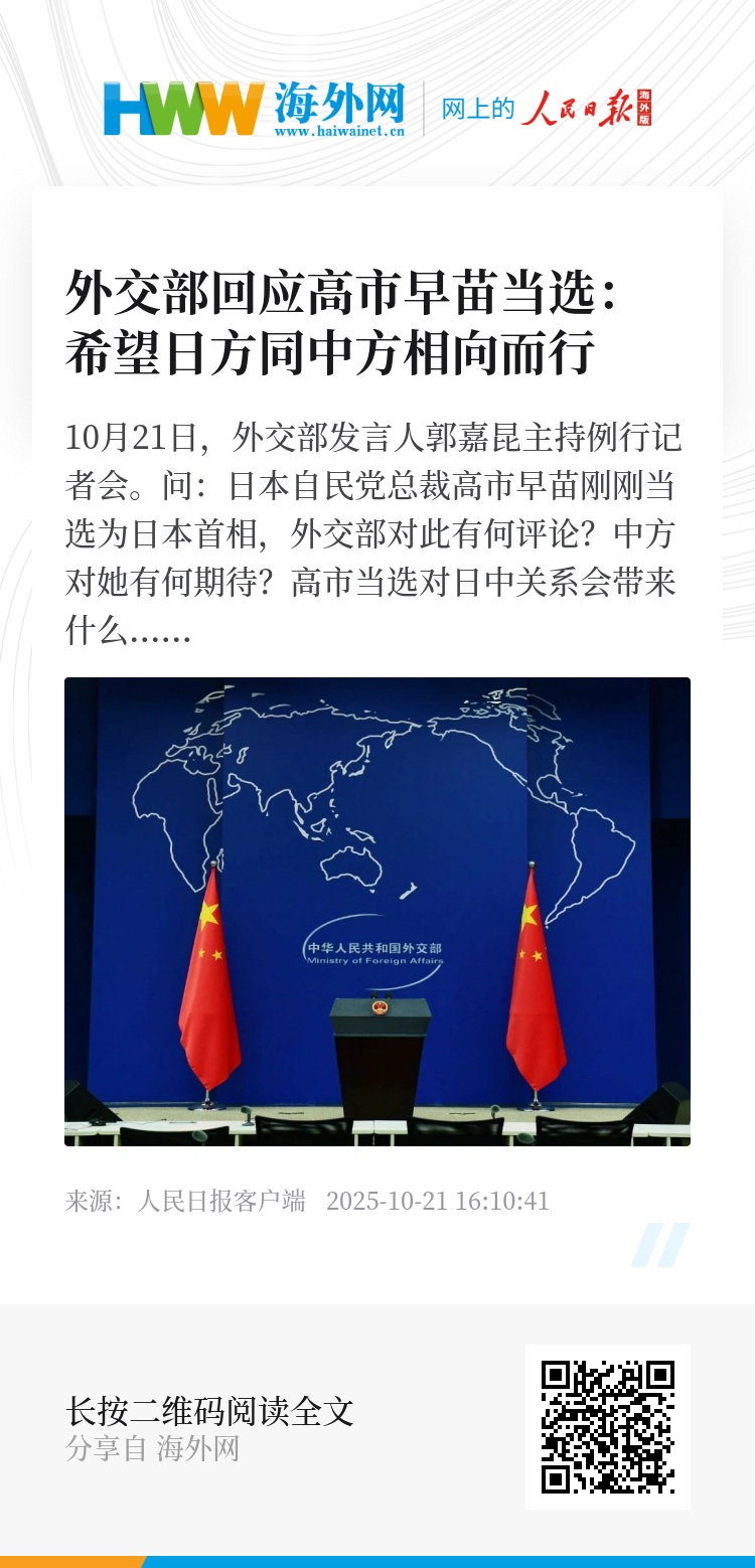 问:日本自民党总裁高市早苗刚刚当选为日本首相,外交部对此有何评论?中方对她有何期待?高市当选对日中关系会带来什么样的影响?