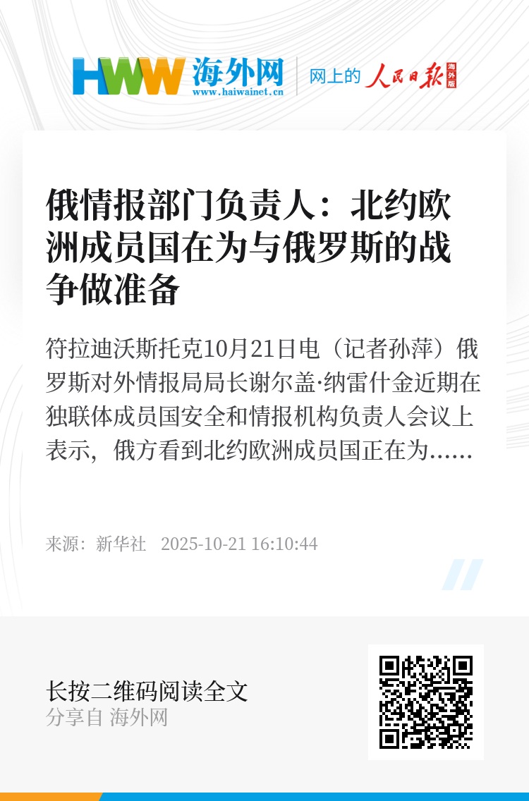 新华社符拉迪沃斯托克10月21日电(记者孙萍)俄罗斯对外情报局局长谢尔盖·纳雷什金近期在独联体成员国安全和情报机构负责人会议上表示,俄方看到北约欧洲成员国正在为与俄罗斯的战争做准备,准备工作的主要任务是确保北约盟军反应部队在短时间内获得所有必要资源。