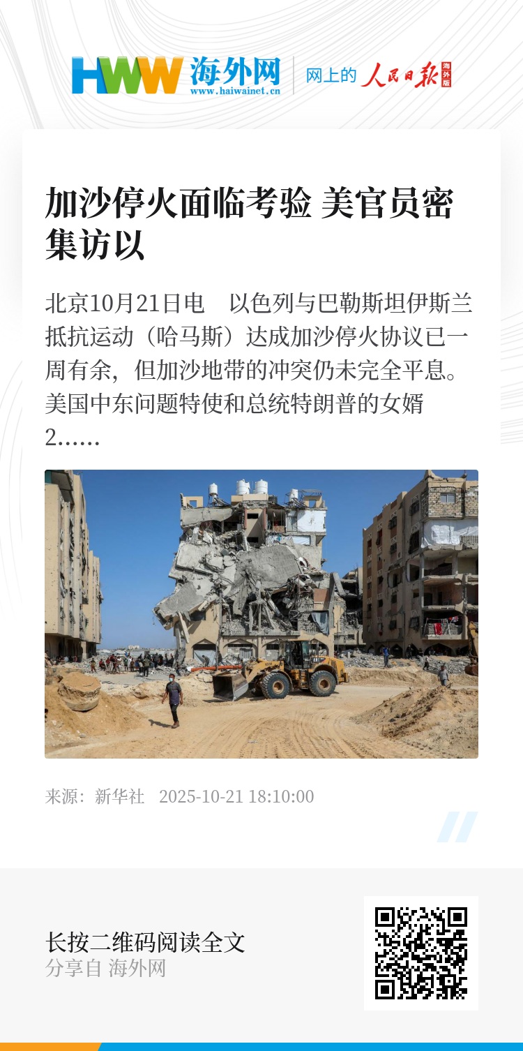 新华社北京10月21日电 以色列与巴勒斯坦伊斯兰抵抗运动(哈马斯)达成加沙停火协议已一周有余,但加沙地带的冲突仍未完全平息。美国中东问题特使和总统特朗普的女婿20日与以总理内塔尼亚胡会晤,副总统万斯也预定访以。媒体分析,美方试图通过这些访问推动停火协议持续得到落实。