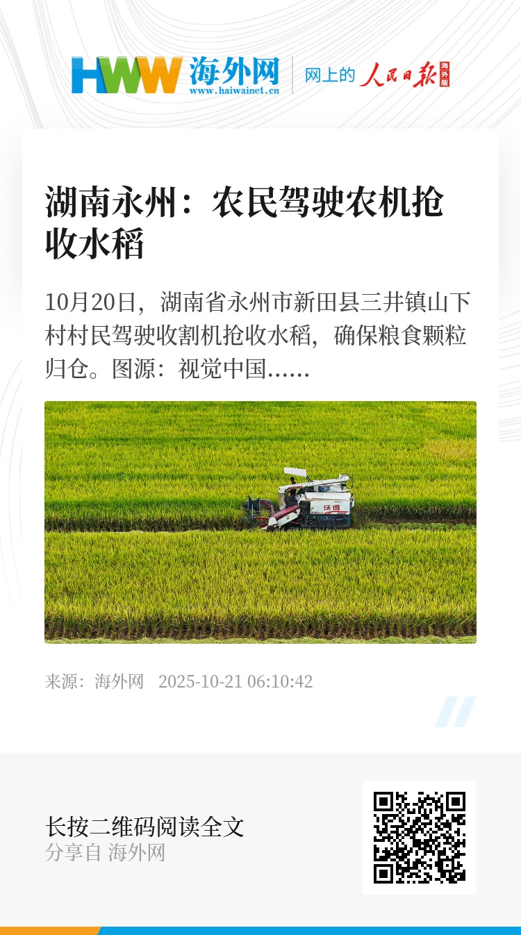 10月20日,湖南省永州市新田县三井镇山下村村民驾驶收割机抢收水稻,确保粮食颗粒归仓。图源:视觉中国