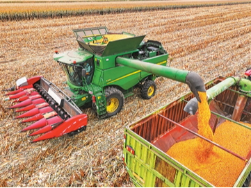 目前,内蒙古通辽市今年种植的近2000万亩玉米收获已过半,田间地头一派忙碌景象。图为通辽市科尔沁区敖力布皋镇,农机手驾驶收割机把玉米装入卡车。