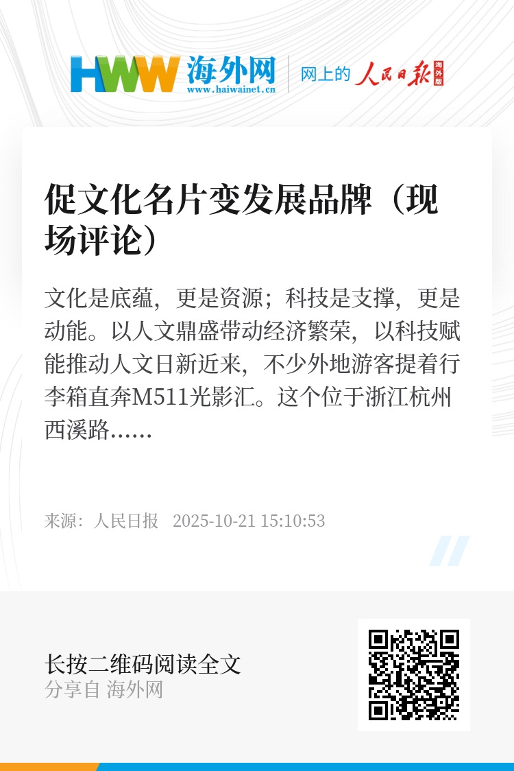 在浙江,西湖美景、良渚古城、乌镇水乡……独具魅力的文化名片越擦越亮;动漫游戏、人工智能、电子商务……充满创新的产业品牌名声在外。文化是底蕴,更是资源;科技是支撑,更是动能。以人文鼎盛带动经济繁荣,以科技赋能推动人文日新,定能实现物质富足、精神富有的有机统一。(刘军国 作者为本报浙江分社记者)