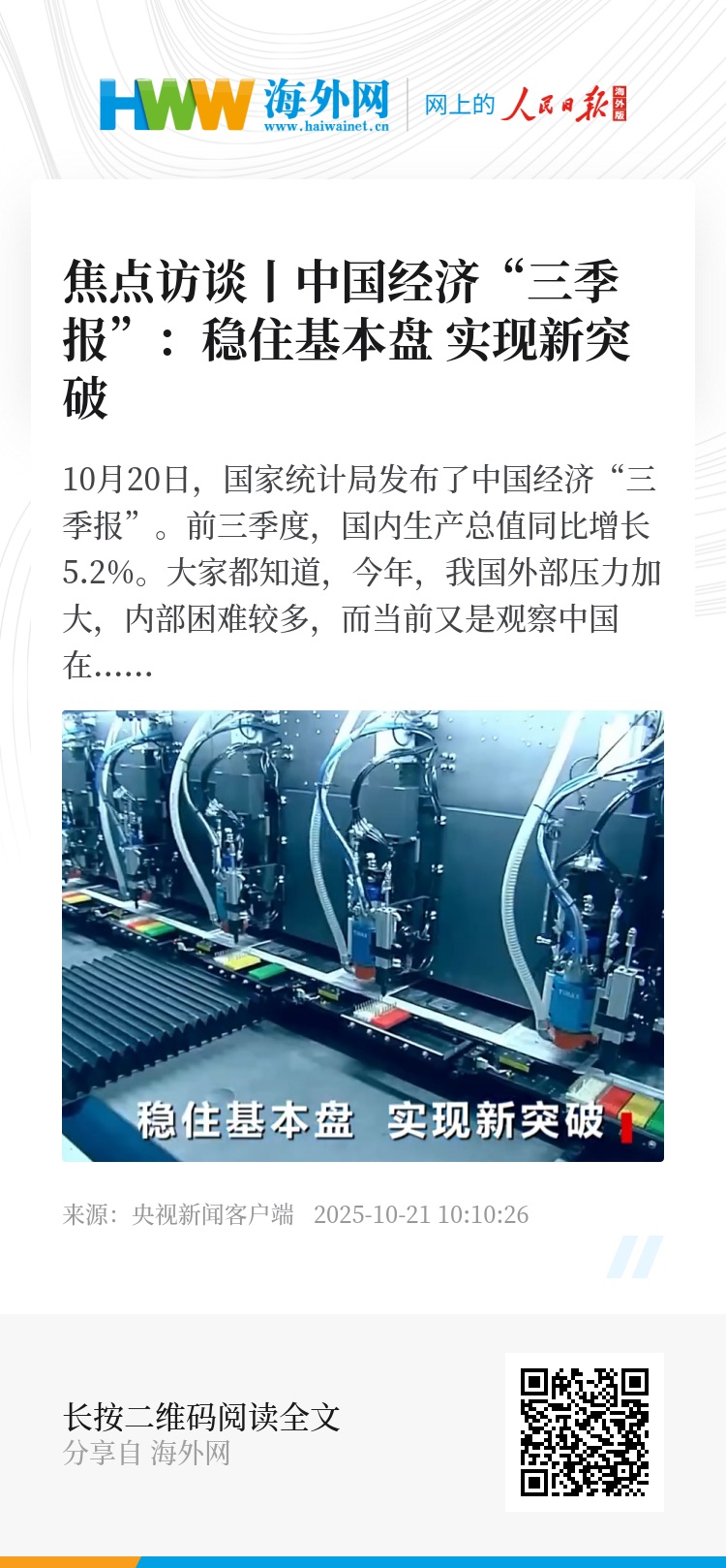 国家统计局新闻发言人、国民经济综合统计司司长 付凌晖:前三季度5.2%的经济增速,在主要经济体当中仍然位居世界前列,说明了中国经济继续成为全球经济增长的重要来源。