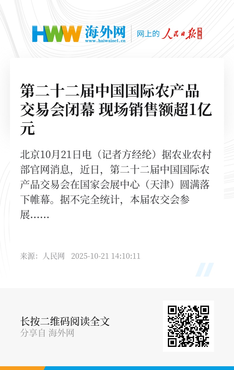 人民网北京10月21日电(记者方经纶)据农业农村部官网消息,近日,第二十二届中国国际农产品交易会在国家会展中心(天津)圆满落下帷幕。据不完全统计,本届农交会参展人数超30万人次,日均参展人数超10万人,现场销售额超1亿元,达成意向合作达8500多项。