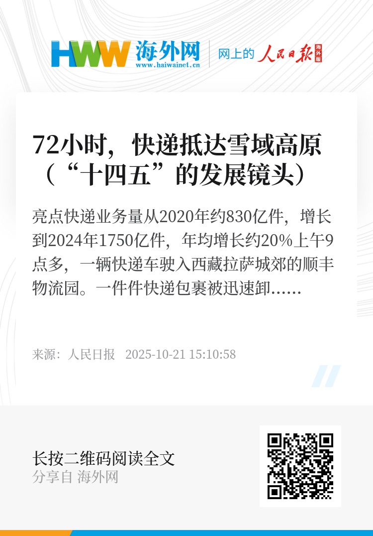 从全国看,快递业务量从2020年的约830亿件,增长到2024年的1750亿件,年均增长约20%。平均每天的揽收快件量超过5亿件,相当于每秒有近6000件快递进入寄递渠道。快递业务量迅速增长,这在西藏尤为明显。