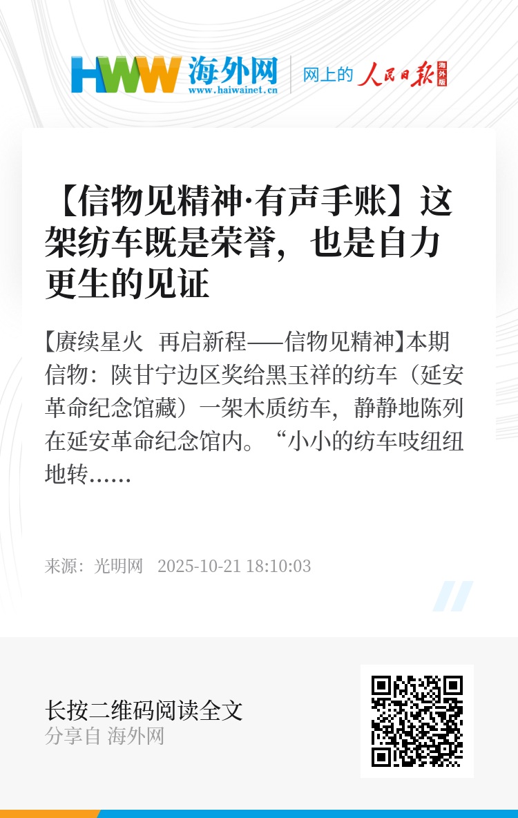 一架木质纺车,静静地陈列在延安革命纪念馆内。“小小的纺车吱纽纽地转,摇起了纺车纺线线……”面对这架陕甘宁边区奖给黑玉祥的纺车,唱起这首《纺车谣》,总会把我们的思绪带回那段“自己动手、丰衣足食”的岁月。