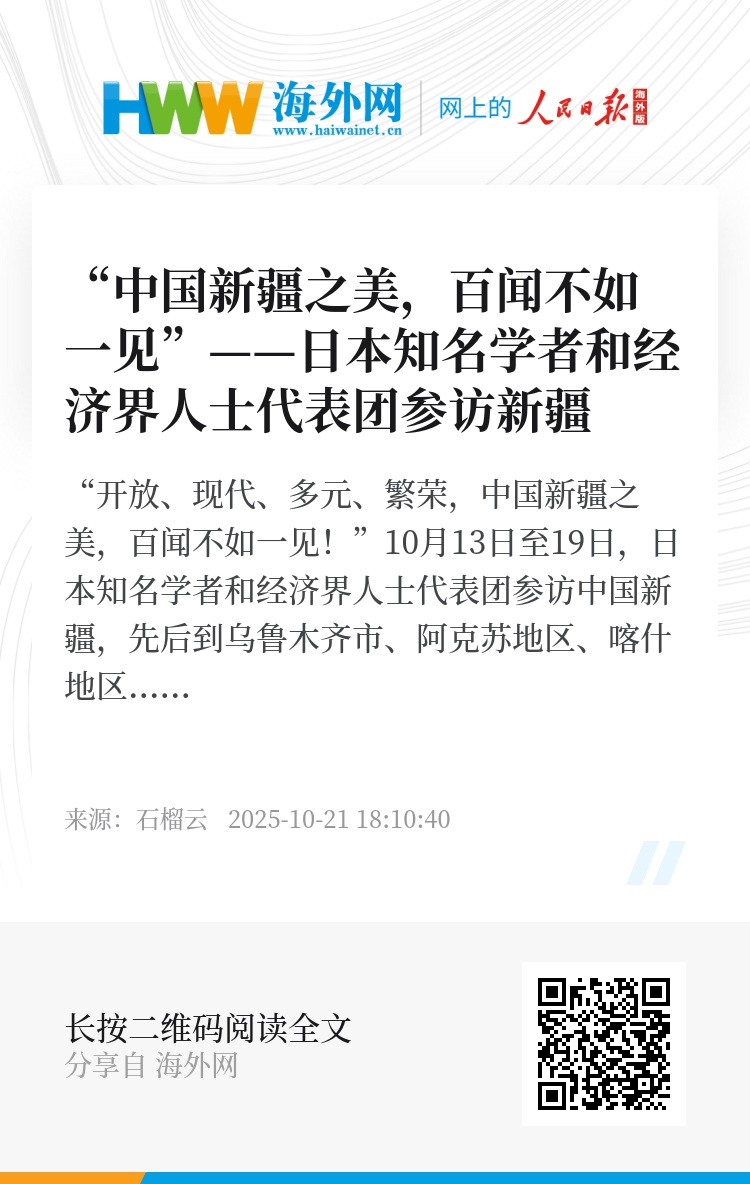 “开放、现代、多元、繁荣,中国新疆之美,百闻不如一见!”10月13日至19日,日本知名学者和经济界人士代表团参访中国新疆,先后到乌鲁木齐市、阿克苏地区、喀什地区等地,见证各民族共同团结奋斗、共同繁荣发展的良好态势。大家纷纷表示,中国新疆潜力无限,未来可期。