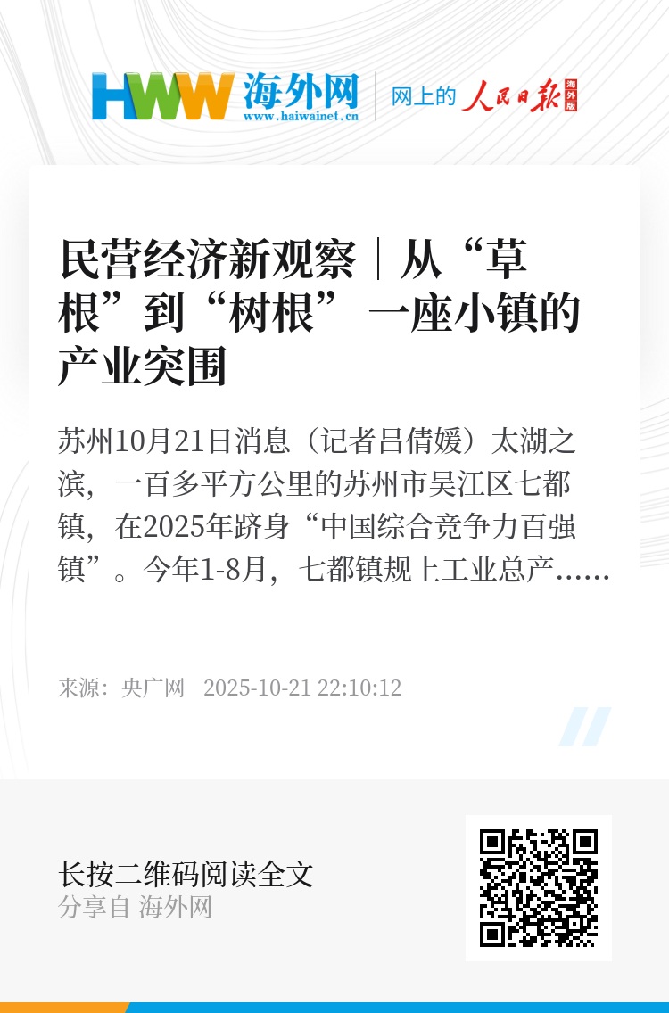 央广网苏州10月21日消息(记者吕倩媛)太湖之滨,一百多平方公里的苏州市吴江区七都镇,在2025年跻身“中国综合竞争力百强镇”。