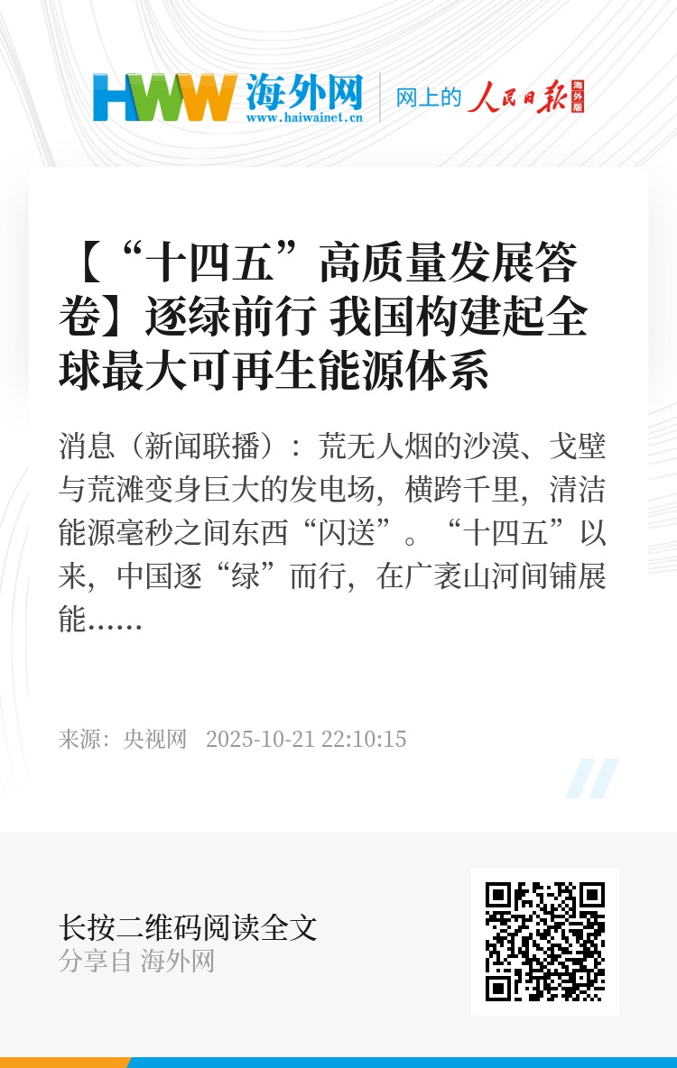 今天,我国已建成了全球最大、最完整的新能源产业链,非化石能源消费占比20%的“十四五”目标如期完成。