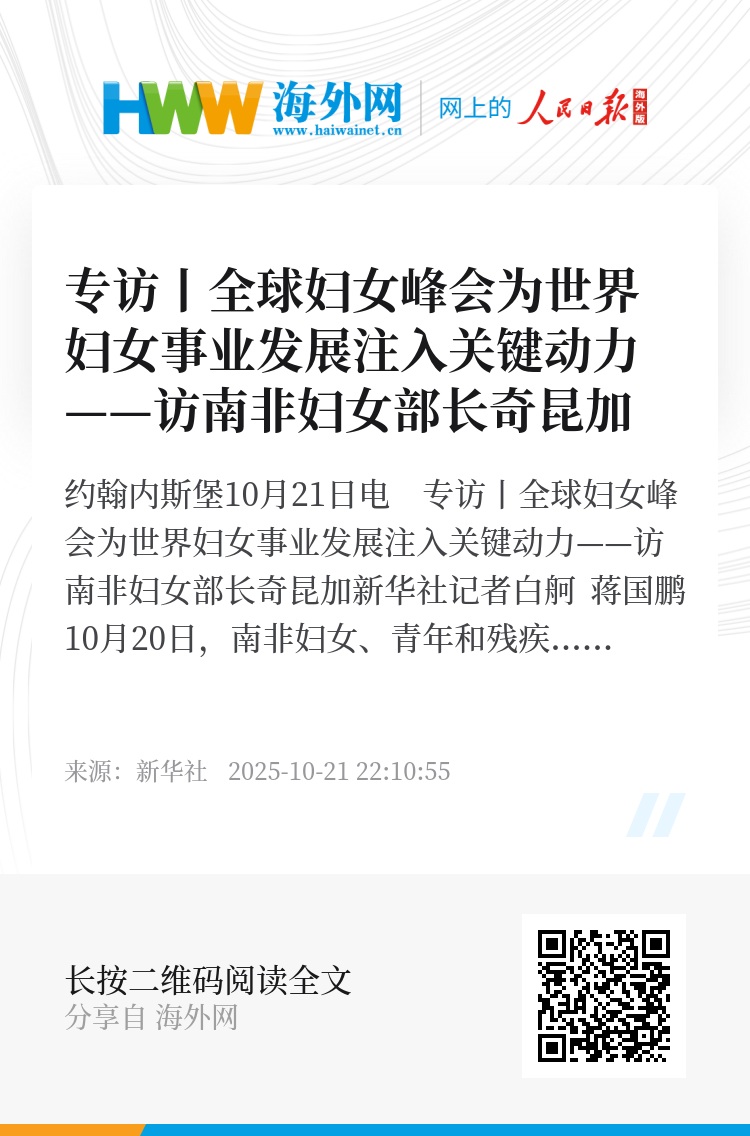 新华社约翰内斯堡10月21日电 专访丨全球妇女峰会为世界妇女事业发展注入关键动力——访南非妇女部长奇昆加