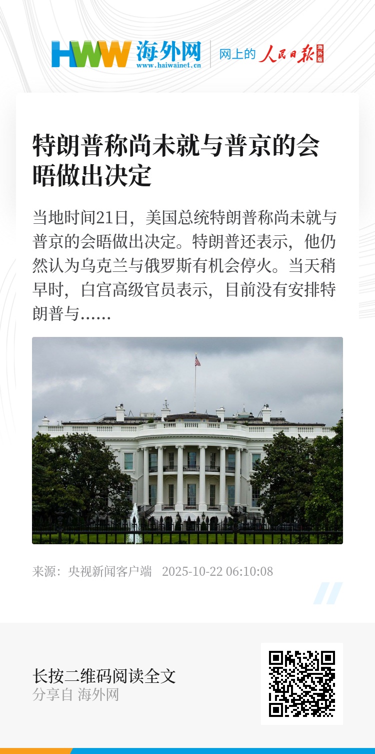 当地时间21日,美国总统特朗普称尚未就与普京的会晤做出决定。特朗普还表示,他仍然认为乌克兰与俄罗斯有机会停火。