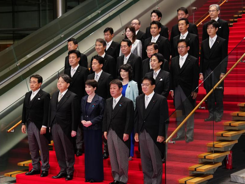 10月21日,日本首相高市早苗(前排中)在东京的首相官邸率阁僚合影。新华社记者 贾浩成 摄