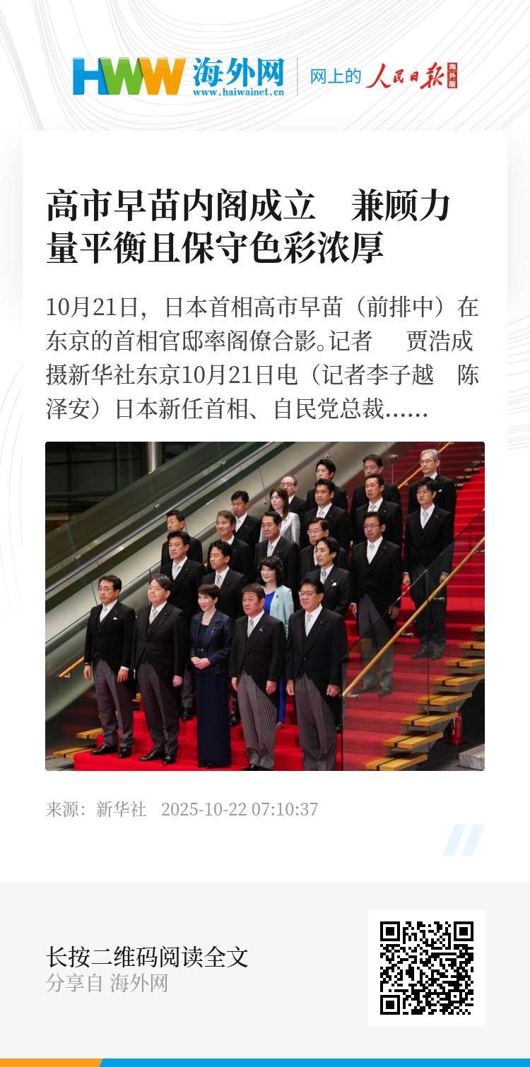 新华社东京10月21日电(记者李子越 陈泽安)日本新任首相、自民党总裁高市早苗21日晚组建新内阁,标志着由自民党和日本维新会组成的执政联盟正式启动。