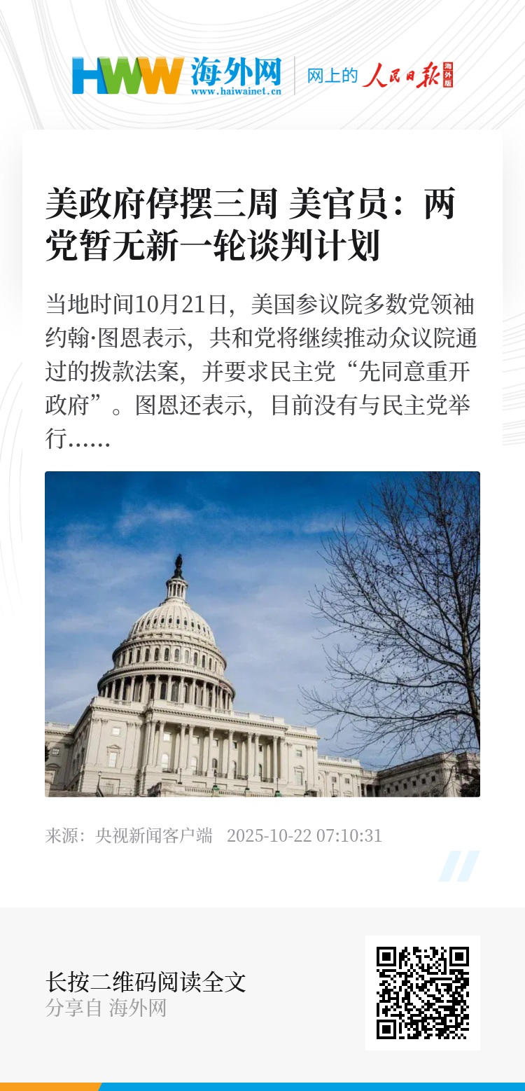 当地时间10月21日,美国参议院多数党领袖约翰·图恩表示,共和党将继续推动众议院通过的拨款法案,并要求民主党“先同意重开政府”。图恩还表示,目前没有与民主党举行新一轮谈判的计划,认为应由民主党先提出方案。