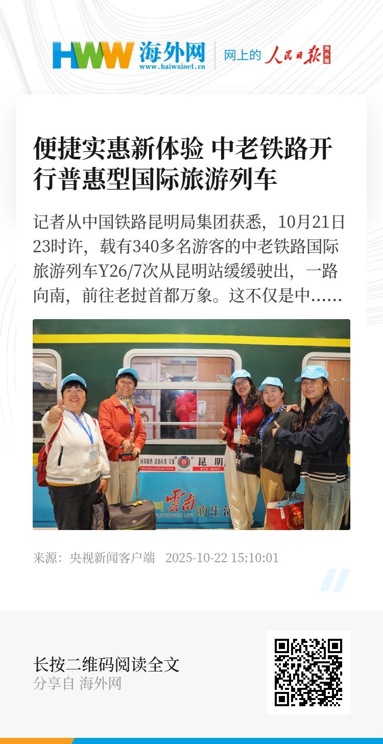 记者从中国铁路昆明局集团获悉,10月21日23时许,载有340多名游客的中老铁路国际旅游列车Y26/7次从昆明站缓缓驶出,一路向南,前往老挝首都万象。这不仅是中老铁路开行的首趟普惠型国际旅游列车,更是区域互联互通、铁旅深度融合发展的重要里程碑。