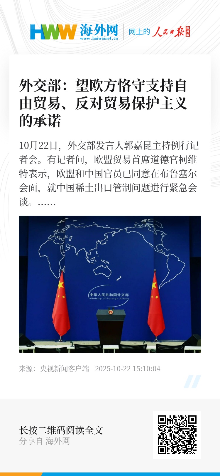 10月22日,外交部发言人郭嘉昆主持例行记者会。有记者问,欧盟贸易首席道德官柯维特表示,欧盟和中国官员已同意在布鲁塞尔会面,就中国稀土出口管制问题进行紧急会谈。中方对此有何评论?