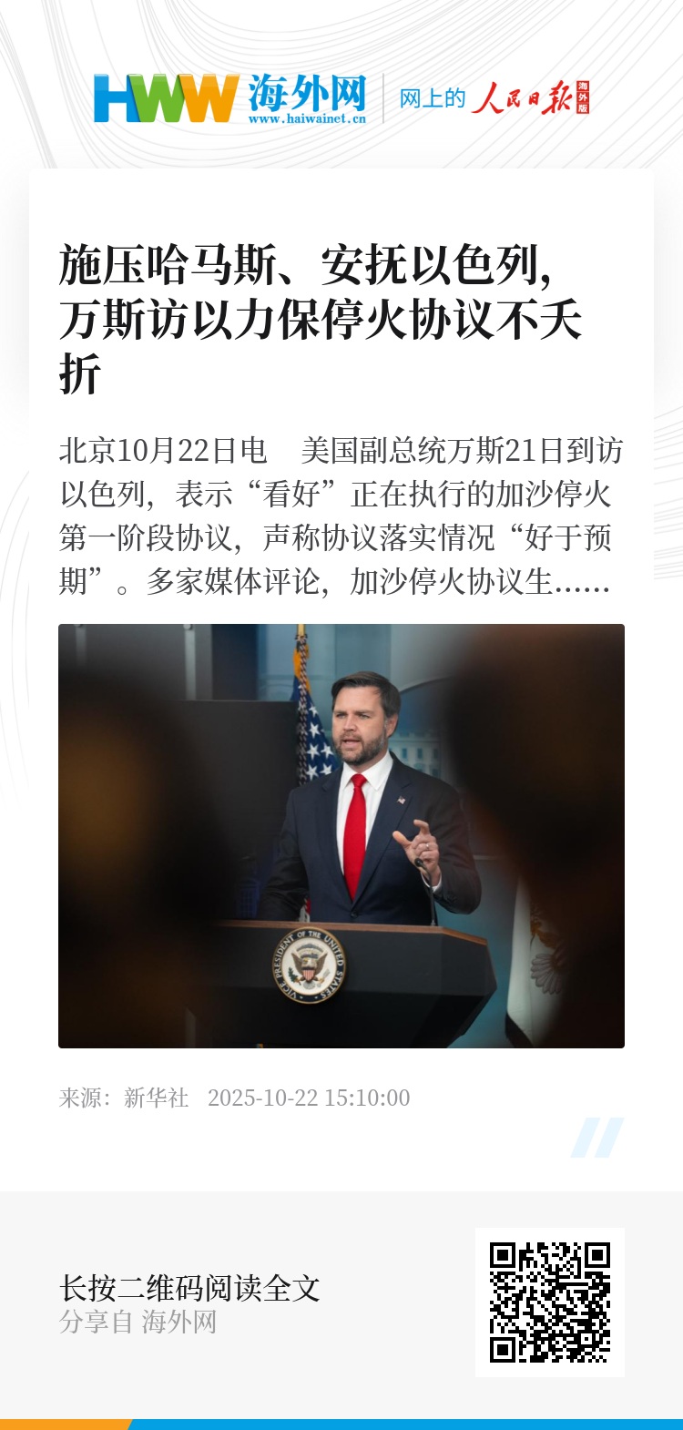 新华社北京10月22日电 美国副总统万斯21日到访以色列,表示“看好”正在执行的加沙停火第一阶段协议,声称协议落实情况“好于预期”。多家媒体评论,加沙停火协议生效已有十余天,冲突仍未完全平息,冲突双方多次互相指责对方违反协议,凸显协议之脆弱性,万斯此访意在敲打哈马斯、安抚以色列、避免协议夭折。