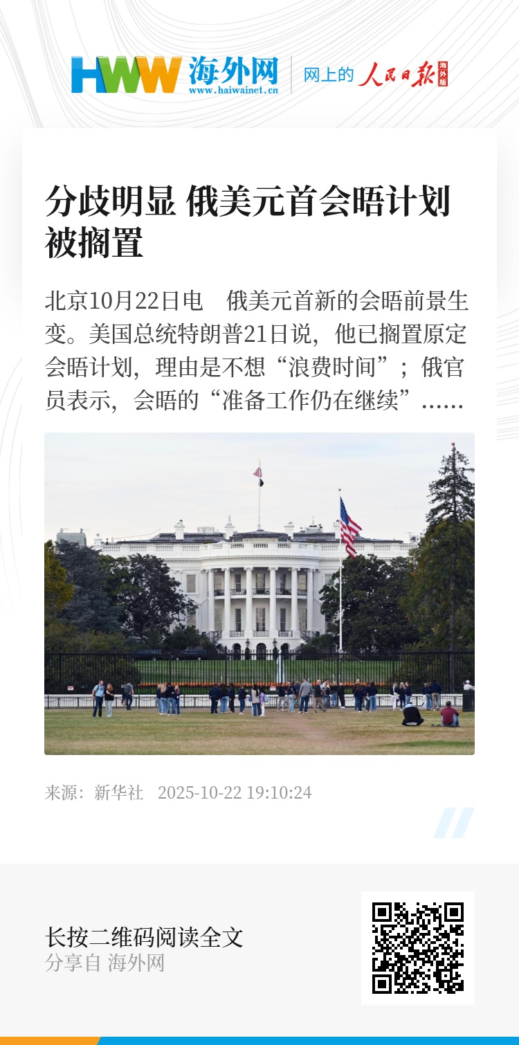 新华社北京10月22日电 俄美元首新的会晤前景生变。美国总统特朗普21日说,他已搁置原定会晤计划,理由是不想“浪费时间”;俄官员表示,会晤的“准备工作仍在继续”。