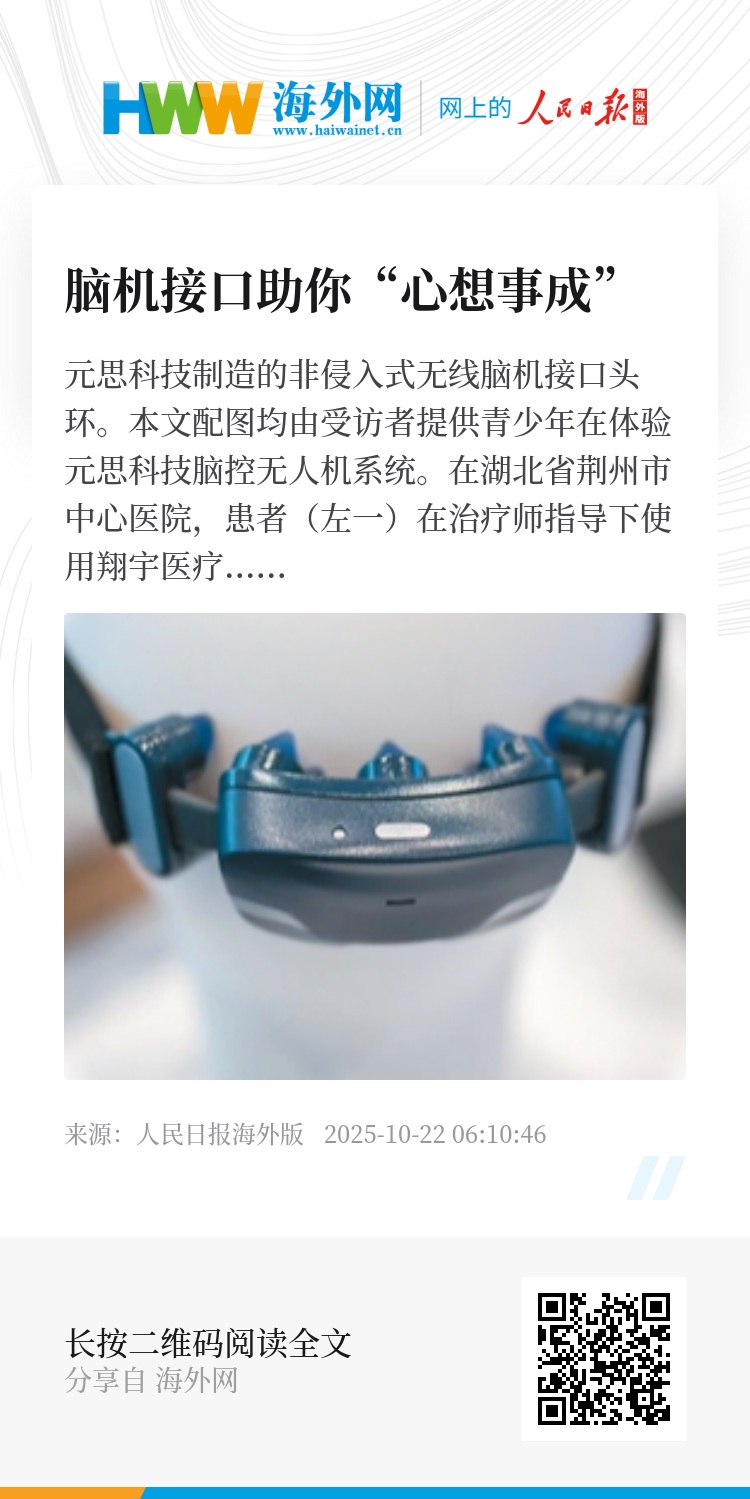元思(青岛)科技有限公司内,一位体验者头戴轻盈头环,紧盯计算机屏幕十几秒,其身旁的无人机便应声起飞,依次穿过两道高低不同的拱门。