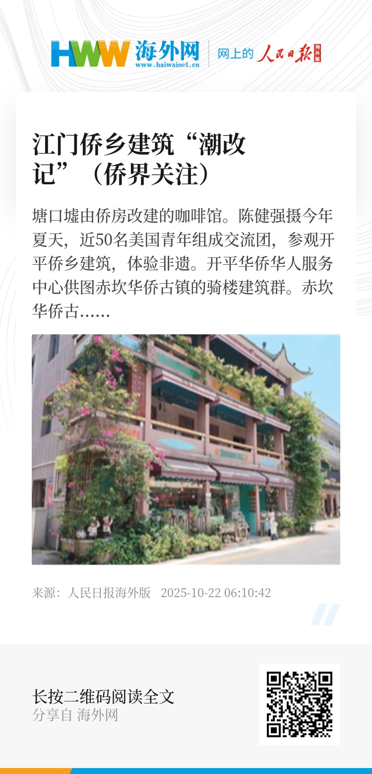 从建筑“潮改”到文化传承,从个体参与到创客集聚,江门侨乡正写下许多建筑与人文共同新生的故事。(记者 李晓宏 林子涵)