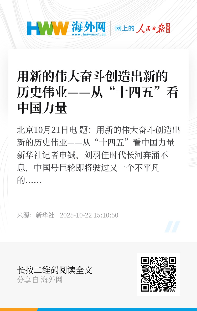 新华社北京10月21日电 题:用新的伟大奋斗创造出新的历史伟业——从“十四五”看中国力量