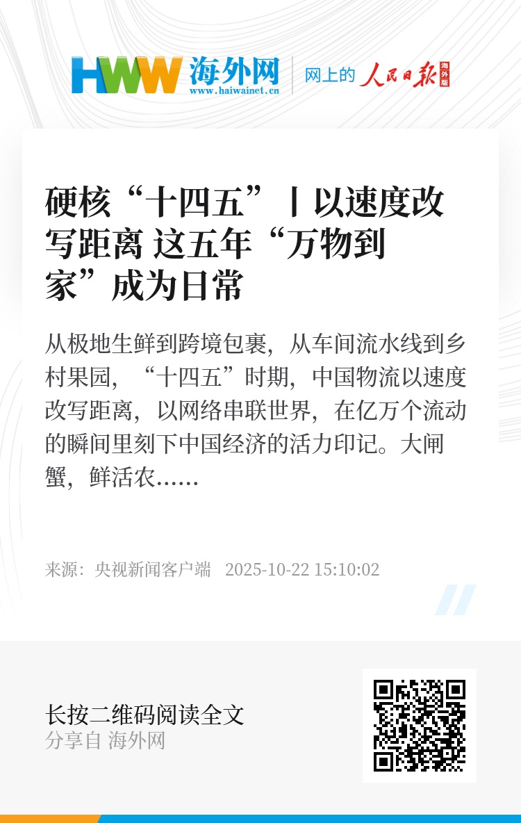 从极地生鲜到跨境包裹,从车间流水线到乡村果园,“十四五”时期,中国物流以速度改写距离,以网络串联世界,在亿万个流动的瞬间里刻下中国经济的活力印记。