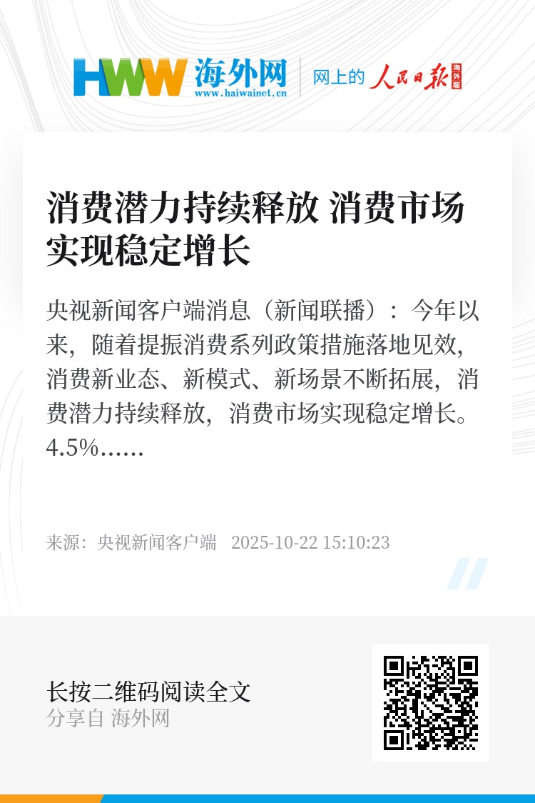 央视新闻客户端消息(新闻联播):今年以来,随着提振消费系列政策措施落地见效,消费新业态、新模式、新场景不断拓展,消费潜力持续释放,消费市场实现稳定增长。