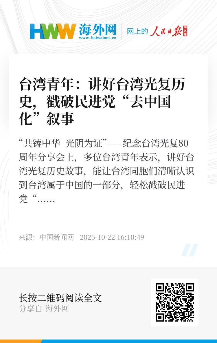 “共铸中华 光阴为证”——纪念台湾光复80周年分享会上,多位台湾青年表示,讲好台湾光复历史故事,能让台湾同胞们清晰认识到台湾属于中国的一部分,轻松戳破民进党“去中国化”叙事。(陈文韬)