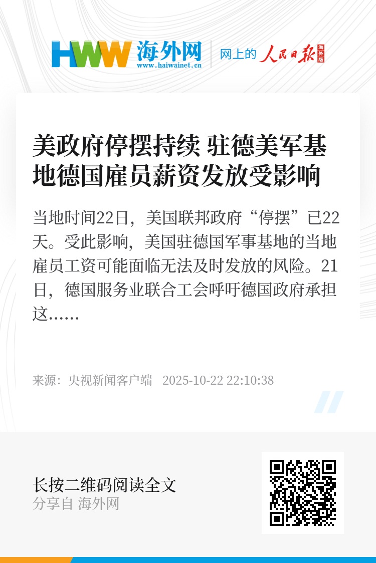 据报道,在后勤、餐饮、消防和安保等非军事领域工作的德国雇员的工资通常是在获得美国批准后发放。自10月1日美国联邦政府“停摆”以来,这一款项至今仍未获得批准。