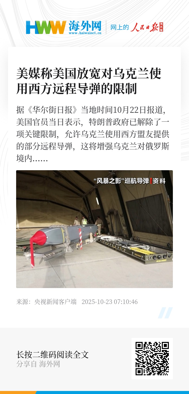 据《华尔街日报》当地时间10月22日报道,美国官员当日表示,特朗普政府已解除了一项关键限制,允许乌克兰使用西方盟友提供的部分远程导弹,这将增强乌克兰对俄罗斯境内目标的打击能力。