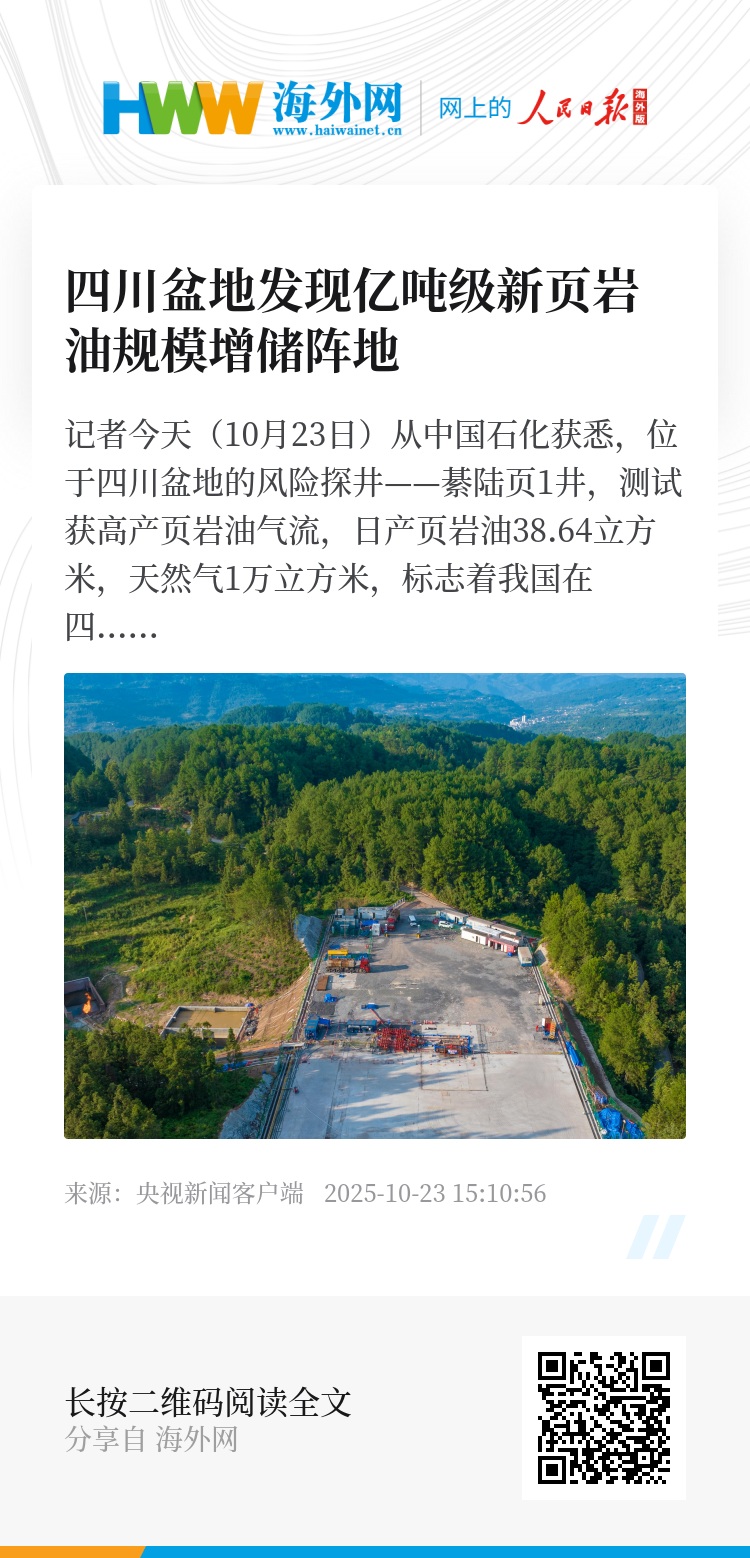 记者今天(10月23日)从中国石化获悉,位于四川盆地的风险探井——綦陆页1井,测试获高产页岩油气流,日产页岩油38.64立方米,天然气1万立方米,标志着我国在四川盆地发现了一个资源量达亿吨级的新页岩油规模增储阵地。