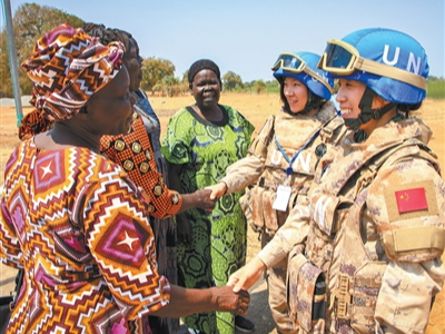 中国第十一批赴南苏丹(朱巴)维和步兵营女兵与当地妇女友好交谈。