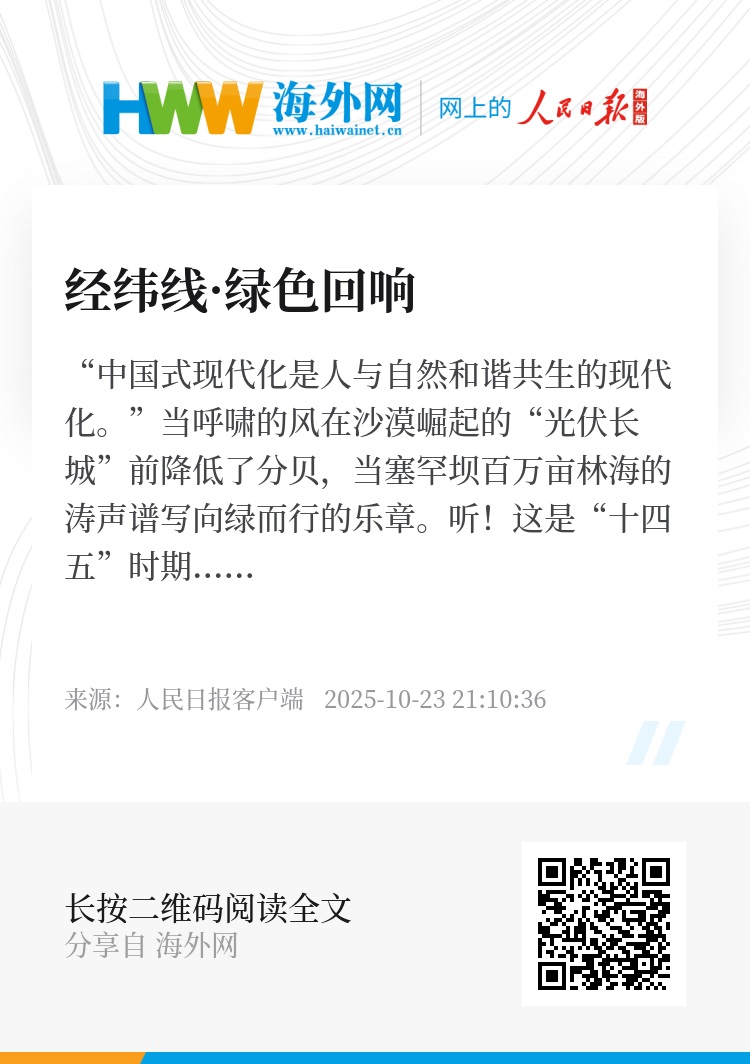 “中国式现代化是人与自然和谐共生的现代化。”当呼啸的风在沙漠崛起的“光伏长城”前降低了分贝,当塞罕坝百万亩林海的涛声谱写向绿而行的乐章。听!这是“十四五”时期的绿色回响。