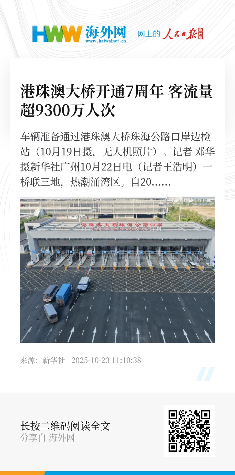 来自珠海边检总站港珠澳大桥边检站的数据显示,2019年全年,港珠澳大桥边检站共查验出入境人员1288万人次,车辆86万辆次;2024年,该边检站查验客流已增长至2700万人次,车辆增长至555万辆次。2025年至今,经口岸出入境客流车流已分别超过2510万人次和546万辆次,同比分别增长17%和25%。