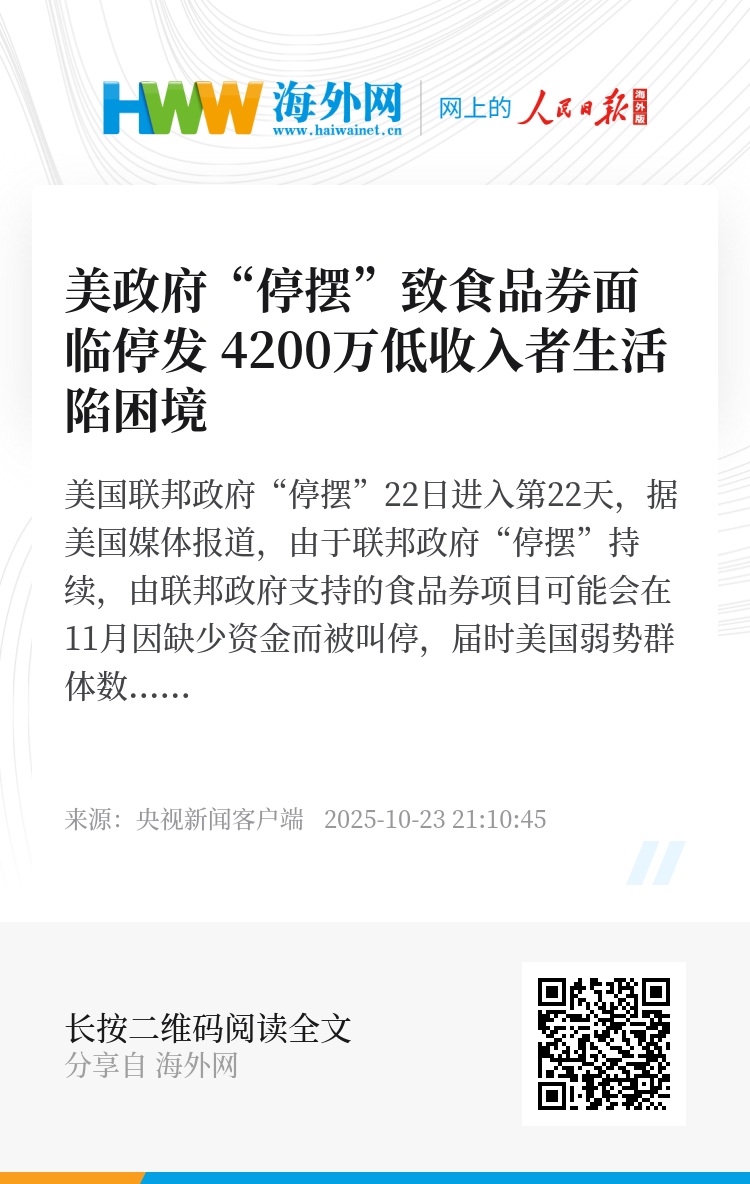 美国联邦政府“停摆”22日进入第22天,据美国媒体报道,由于联邦政府“停摆”持续,由联邦政府支持的食品券项目可能会在11月因缺少资金而被叫停,届时美国弱势群体数千万人将受到影响。
