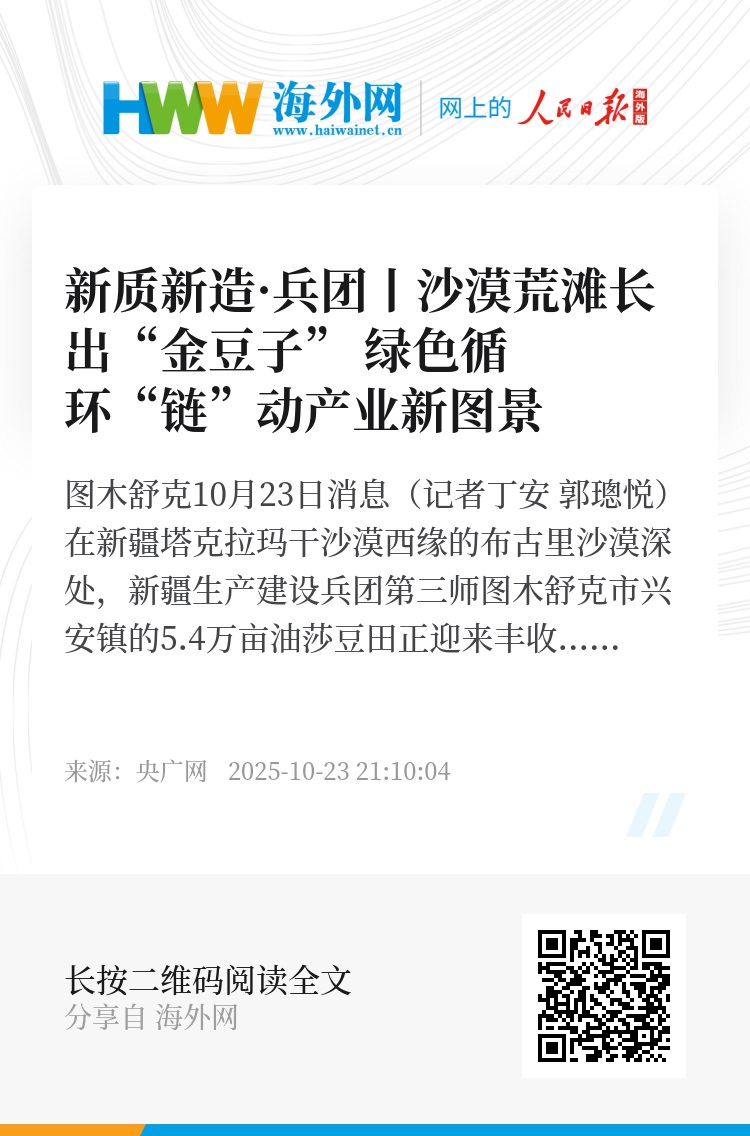 “除了啤酒、面粉、食用油之外,目前还有化妆品公司前来调研,我们油莎豆小小一颗却有大用处。”李谋笑着说,现在兴安镇油莎豆产业链已初具雏形,未来将扩大种植面积至100万亩,建设南疆油饲产业集群,推动“一颗豆”向“百亿链”跨越。