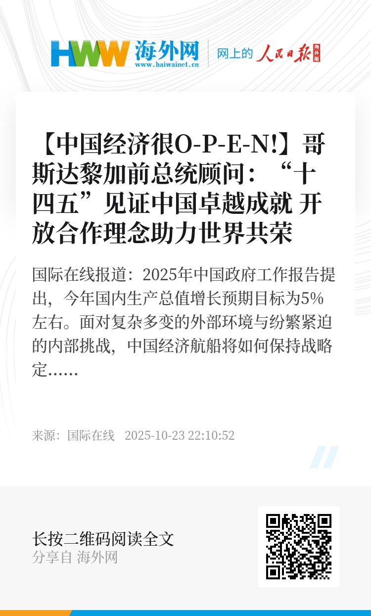哥斯达黎加前总统顾问奥顿·索利斯近日接受国际在线专访时高度评价中国“十四五”时期取得的卓越成就,他指出,中国在清洁能源、交通基建、货币数字化及太空探索等领域均已位居全球顶尖行列。在索利斯看来,中国为哥斯达黎加等其他发展中国家进入更加庞大的国际市场创造了机遇,同时依托高效产能显著降低了绿色转型成本,使各国得以通过低廉的价格获取清洁能源与高科技产品。展望未来,索利斯对中国经济充满信心,并期待中国在国际舞台上继续发挥维护和平与发展的引领作用。
