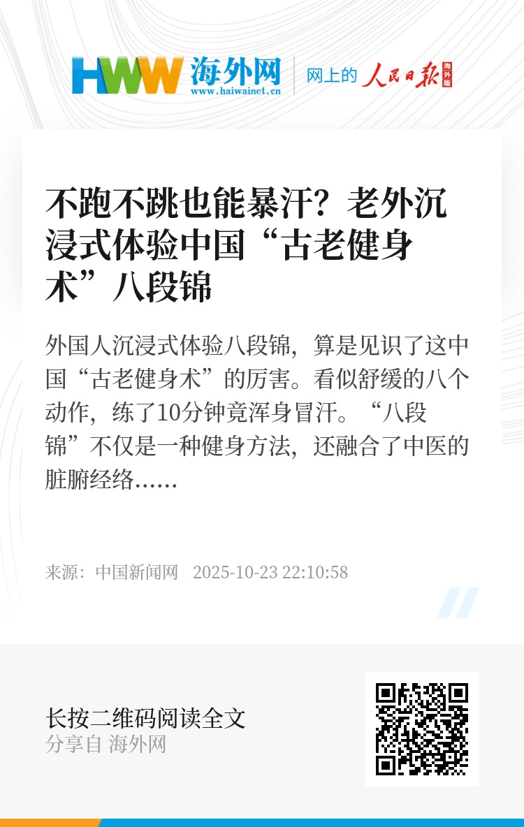 外国人沉浸式体验八段锦,算是见识了这中国“古老健身术”的厉害。看似舒缓的八个动作,练了10分钟竟浑身冒汗。“八段锦”不仅是一种健身方法,还融合了中医的脏腑经络、阴阳五行学说,具有调节人体气血运行、疏通脏腑经络的功效。还等什么呢?快叫上朋友们一起练起来吧!