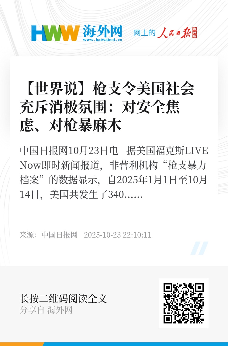 另一种弥漫在美国社会的消极情绪是对涉枪悲剧的麻木,因为枪支暴力已经成为日常新闻。正如一位美国大学生莫莉·阿苏德在谈到保守派活动人士查理·柯克遭枪击身亡时所说的“这就像又一则寻常新闻”,这样的反应折射出当下美国社会“悲剧沦为常态”的现实,并不是人们太冷漠了,而是持续处在枪支暴力之中已经让人们变得麻木。
