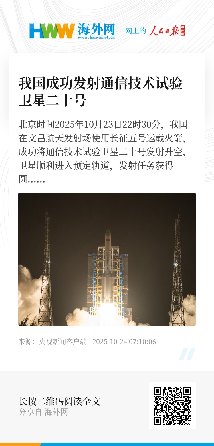 北京时间2025年10月23日22时30分,我国在文昌航天发射场使用长征五号运载火箭,成功将通信技术试验卫星二十号发射升空,卫星顺利进入预定轨道,发射任务获得圆满成功。该卫星主要用于开展多频段、高速率卫星通信技术验证。