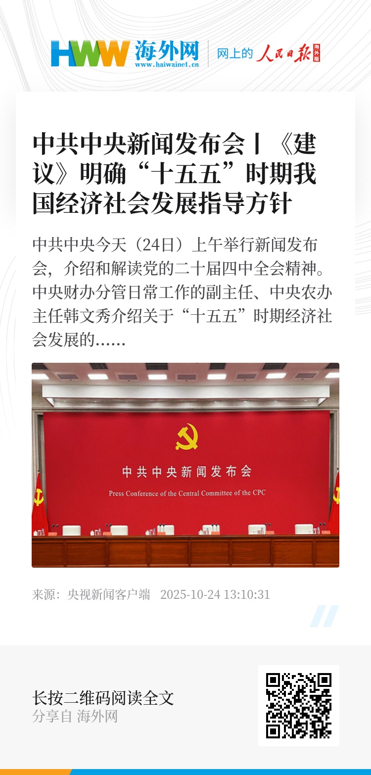 中央财办分管日常工作的副主任、中央农办主任韩文秀介绍关于“十五五”时期经济社会发展的指导方针。《中共中央关于制定国民经济和社会发展第十五个五年规划的建议》强调,要全面贯彻习近平新时代中国特色社会主义思想,围绕全面建成社会主义现代化强国、实现第二个百年奋斗目标,以中国式现代化全面推进中华民族伟大复兴,统筹推进“五位一体”总体布局,协调推进“四个全面”战略布局,完整准确全面贯彻新发展理念,加快构建新发展格局。《中共中央关于制定国民经济和社会发展第十五个五年规划的建议》提出“五个以”“两个推动”“一个确保”的要求,即:坚持以经济建设为中心,以推动高质量发展为主题,以改革创新为根本动力,以满足人民日益增长的美好生活需要为根本目的,以全面从严治党为根本保障,推动经济实现质的有效提升和量的合理增长,推动人的全面发展、全体人民共同富裕迈出坚实步伐,确保基本实现社会主义现代化取得决定性进展。《建议》指出,“十五五”时期经济社会发展必须遵循六项重大原则,即:坚持党的全面领导、坚持人民至上、坚持高质量发展、坚持全面深化改革、坚持有效市场和有为政府相结合、坚持统筹发展和安全。《建议》明确的指导思想和原则,与前几个五年计划一脉相承,保持了连续性、稳定性,又与时俱进、守正创新,具有很强思想性、战略性、指导性。
