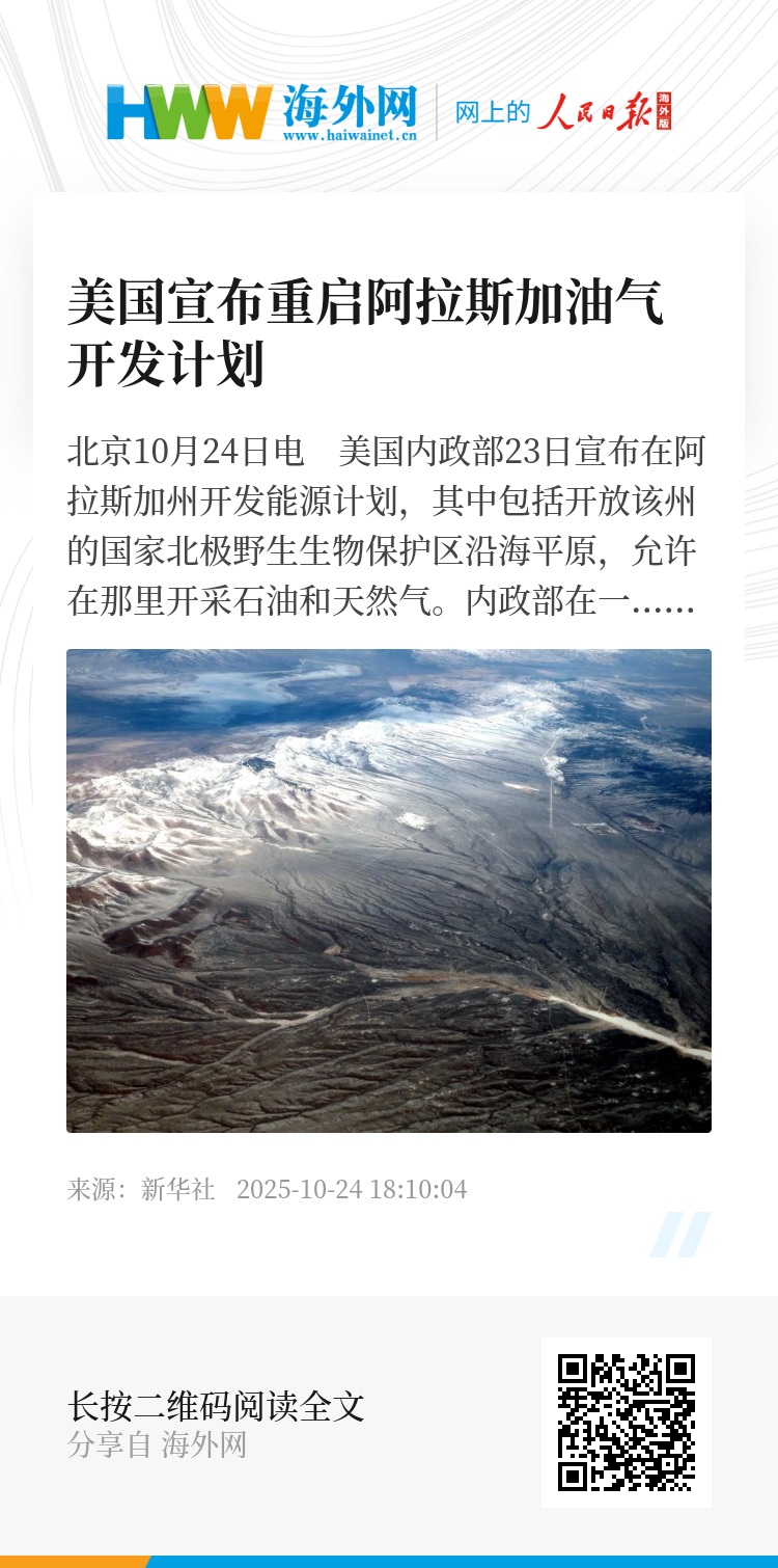 新华社北京10月24日电 美国内政部23日宣布在阿拉斯加州开发能源计划,其中包括开放该州的国家北极野生生物保护区沿海平原,允许在那里开采石油和天然气。