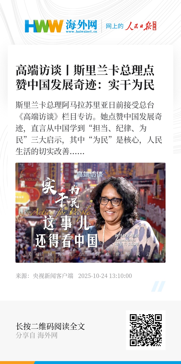 斯里兰卡总理阿马拉苏里亚日前接受总台《高端访谈》栏目专访。她点赞中国发展奇迹,直言从中国学到“担当、纪律、为民”三大启示,其中“为民”是核心,人民生活的切实改善就是中国发展奇迹的最好证明!