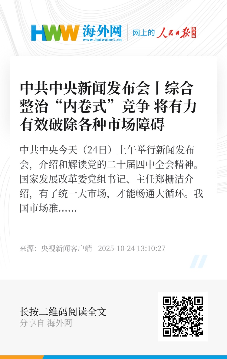 国家发展改革委党组书记、主任郑栅洁介绍,有了统一大市场,才能畅通大循环。我国市场准入负面清单事项,从过去的328项压减到目前的106项,4200余件阻碍要素流动的政策举措得到清理,但还有不少卡点堵点。《中共中央关于制定国民经济和社会发展第十五个五年规划的建议》提出统一市场基础制度规则,破除地方保护和市场分割,规范地方政府经济促进行为,统一市场监管执法,综合整治“内卷式”竞争等举措,将更加有力有效破除各种市场障碍。