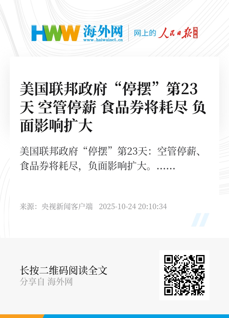 美国联邦政府“停摆”第23天:空管停薪、食品券将耗尽,负面影响扩大。
