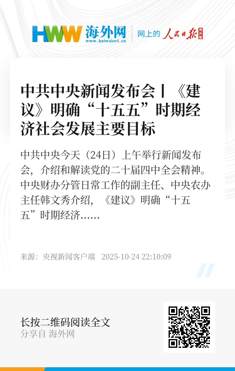 中央财办分管日常工作的副主任、中央农办主任韩文秀介绍,《建议》明确“十五五”时期经济社会发展主要目标,主要包括七个方面:一是高质量发展取得显著成效,二是科技自立自强水平大幅提高,三是进一步全面深化改革取得新突破,四是社会文明程度明显提升,五是人民生活品质不断提高,六是美丽中国建设取得新的重大进展,七是国家安全屏障更加巩固。