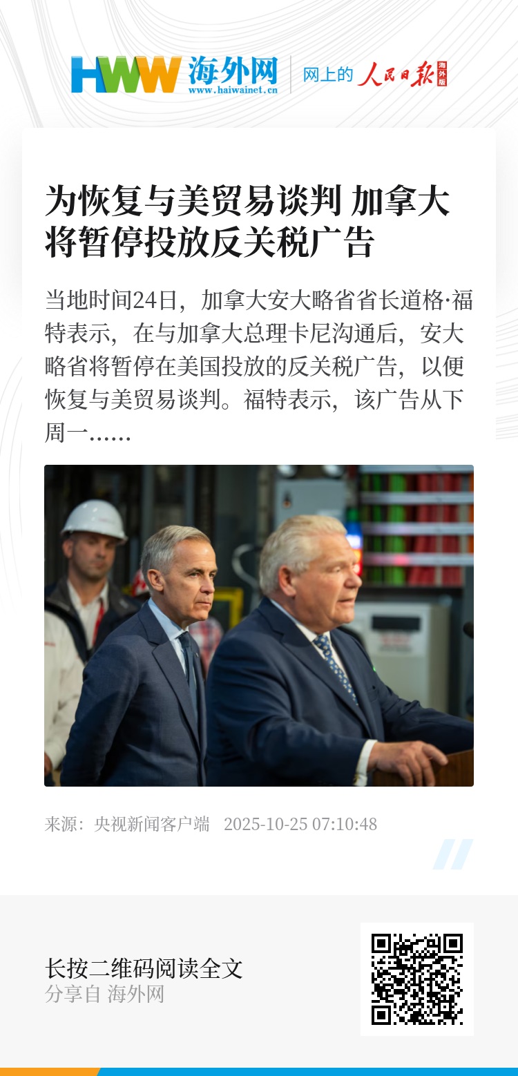 当地时间24日,加拿大安大略省省长道格·福特表示,在与加拿大总理卡尼沟通后,安大略省将暂停在美国投放的反关税广告,以便恢复与美贸易谈判。福特表示,该广告从下周一开始将不再播出。另有知情人士透露,卡尼23日晚间和24日与福特就广告进行了沟通,卡尼希望停止播放该广告。